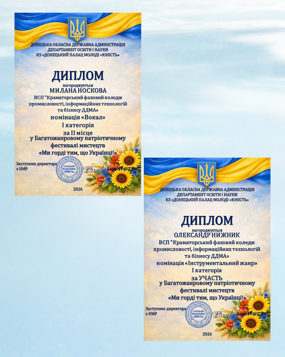 Щиро вітаємо наших студентів та бажаємо їм подальших творчих успіхів, натхнення і нових досягнень. Пишаємося вашими талантами та бажаємо впевнено рухатися вперед, відкриваючи нові можливості.