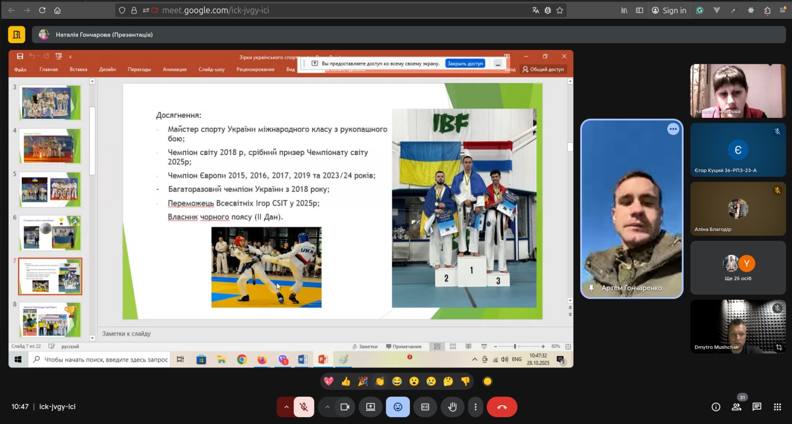 Особливою подією стала зустріч 28.10.2025 із заслуженими майстрами спорту міжнародного класу з рукопашного бою, чемпіонами Європи та світу — Васильєвою К.О., Гончаренком А.А. та Завізіоном О.С. Їхні перемоги — це не просто спортивні досягнення, а символ українського характеру та волі до перемоги. Такі зустрічі дають студентам безцінну можливість поспілкуватися з тими, хто творить сучасну спортивну історію, і надихають їх на власні звершення.