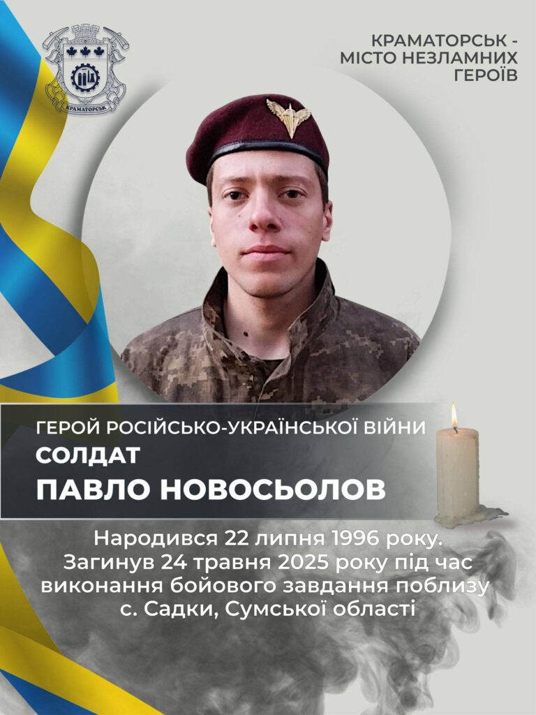 11 липня 2025 року Павла Новосьолова поховали з військовими почестями на військовому меморіалі міста Горішні Плавні. Йому було лише 28 років.