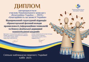 Національний конкурс «Благодійна Україна-2024» – «Благодійність на захисті України» цього року об’єднав майже дві тисячі ініціатив з усієї країни. У числі учасників, відзначених дипломом, — ВСП «Краматорський фаховий коледж промисловості, ІТ та бізнесу ДДМА».
